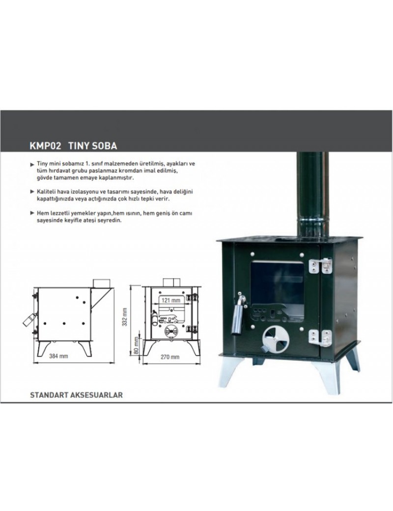 • Tiny mini sobamız 1. sınıf malzemeden üretilmiş, ayakları ve tüm hırdavat grubu paslanmaz kromdan imal edilmiş, gövde tamamen emaye kaplanmıştır.
